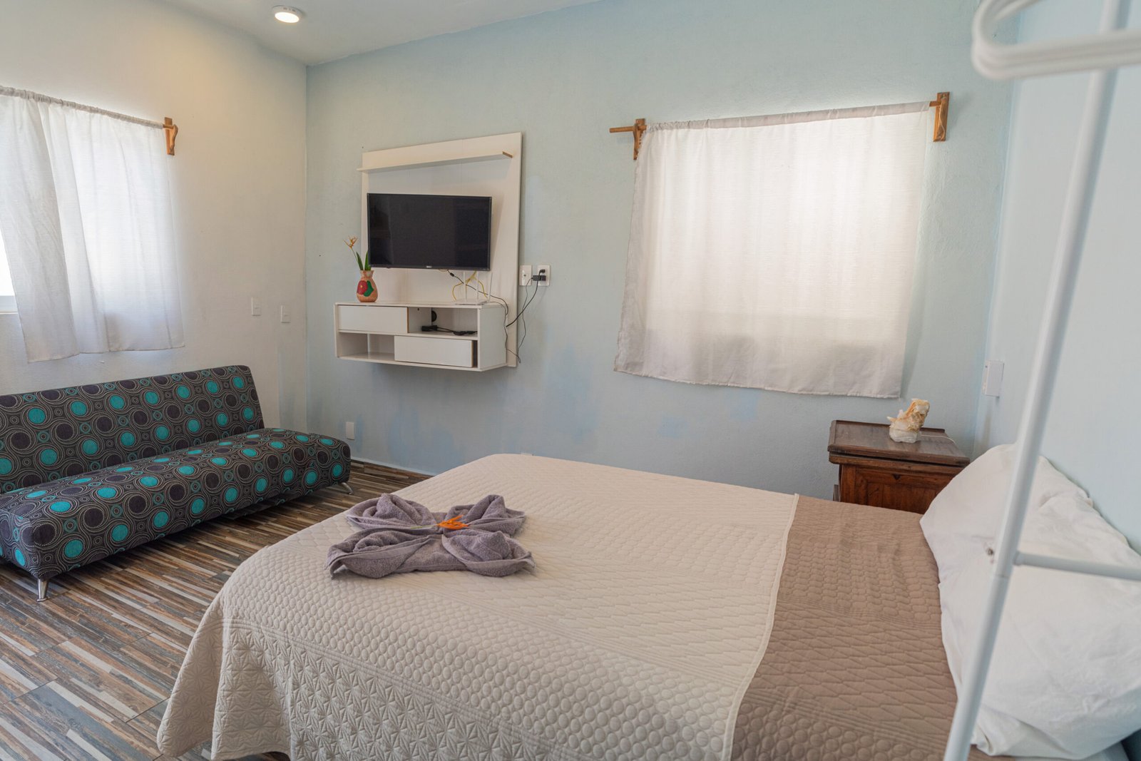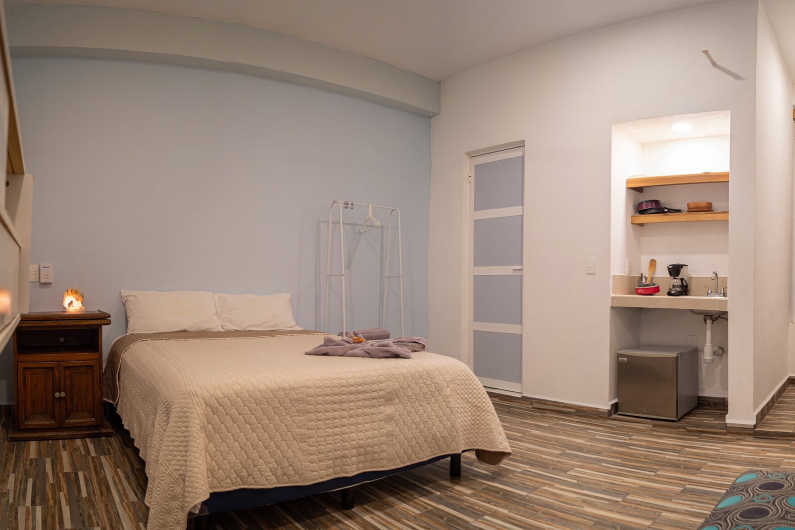 Disfruta de su amplia terraza con malla sombra, baño privado dentro de la habitación, y un espacio perfectamente limpio y sanitizado. Si viajas con tu mascota, ¡también es bienvenida!