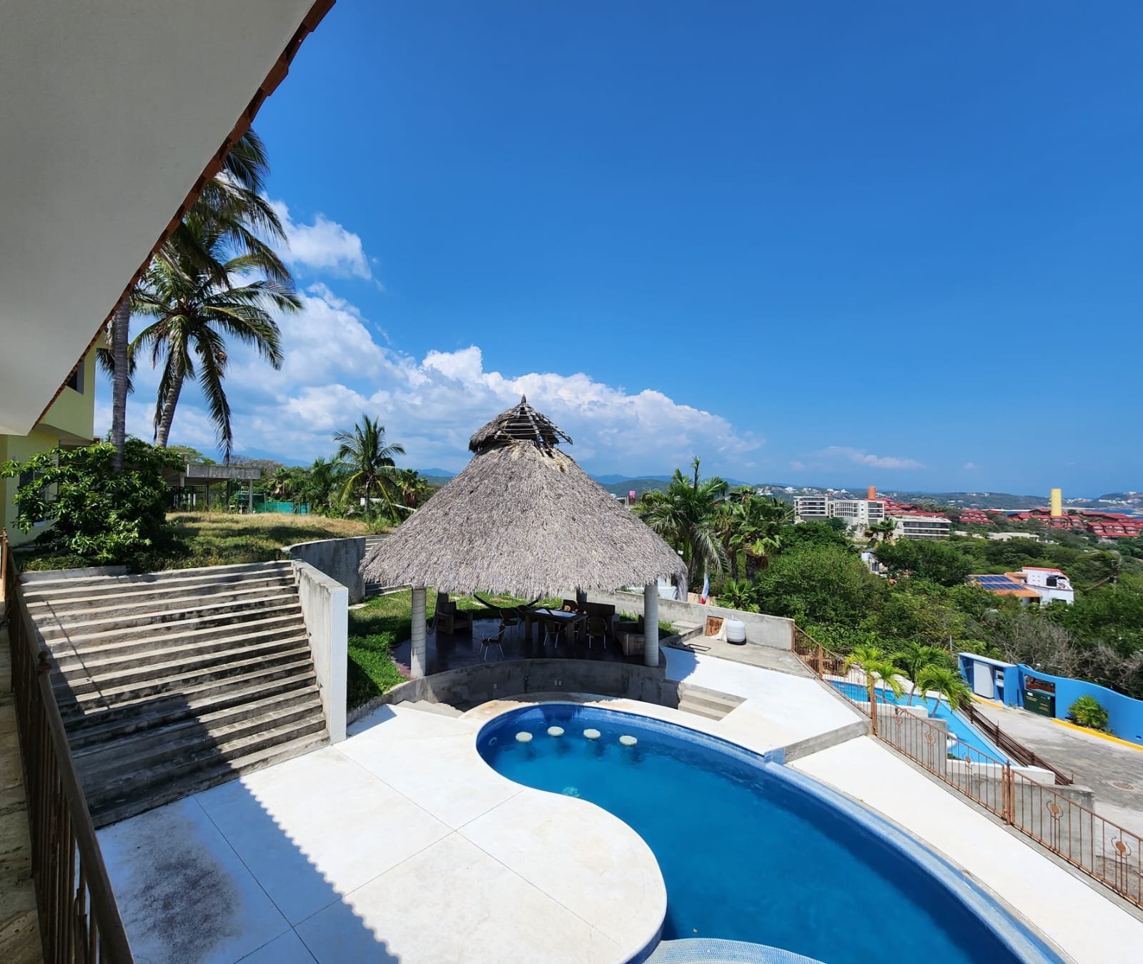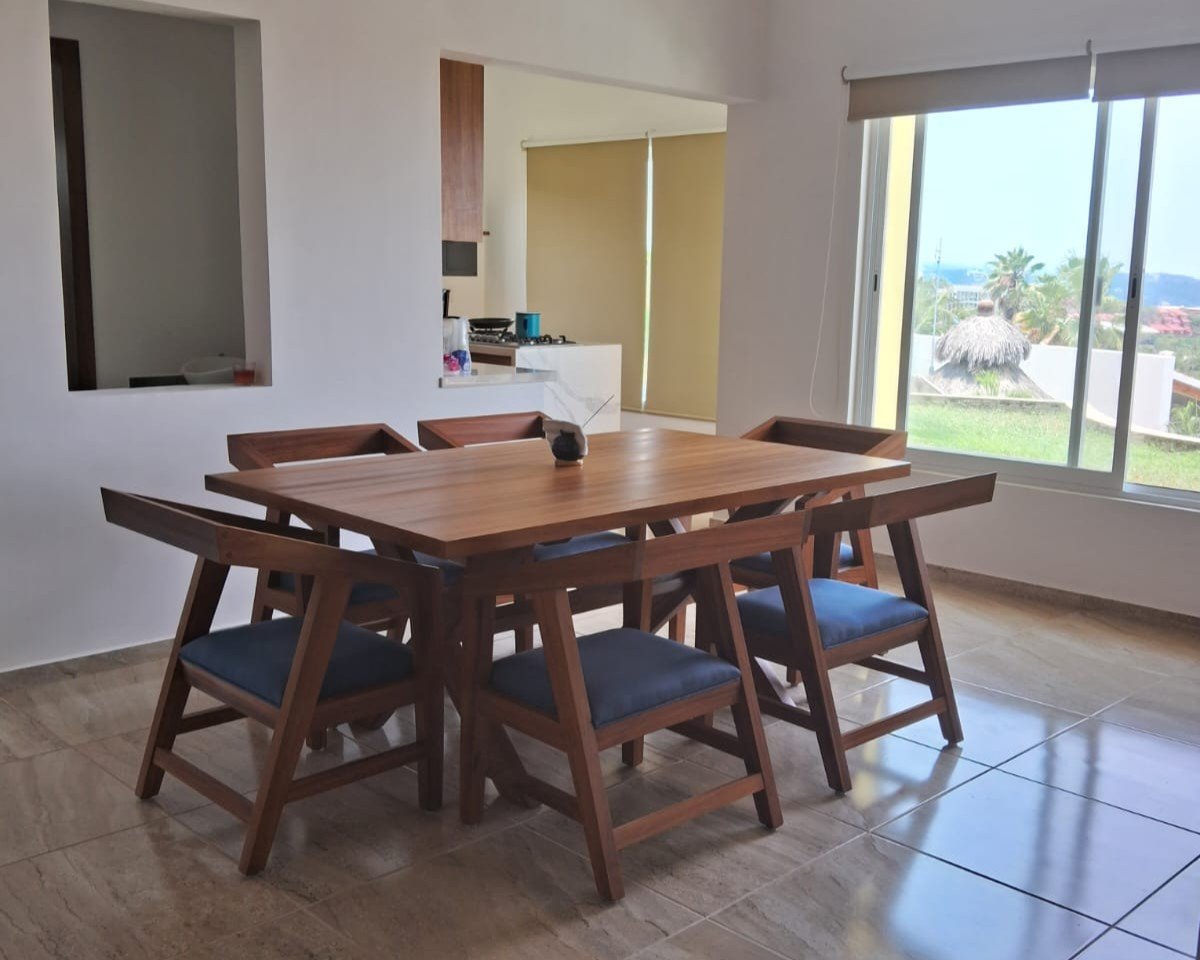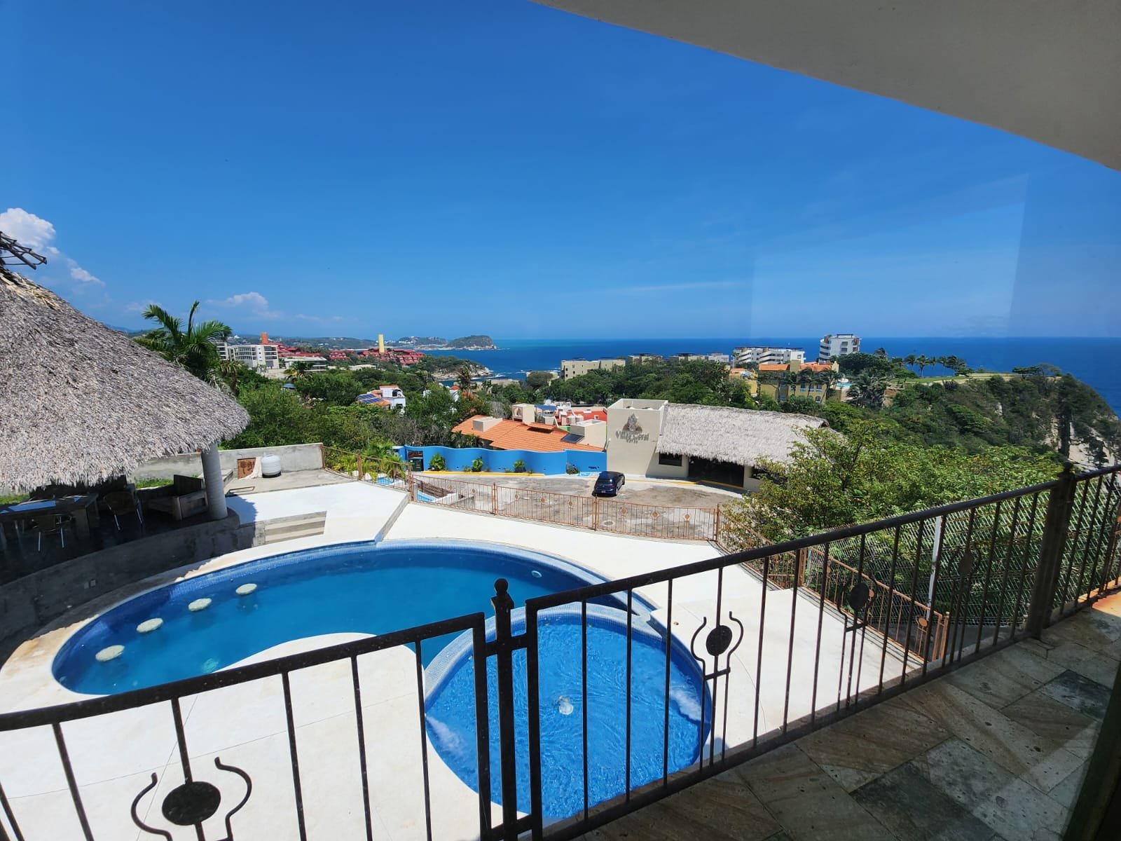En esta casa de descanso vacacional, tienes una vista preciosa hacia la Bahía de Tangolunda, puedes disfrutar de unas hermosas puestas de sol desde su mirador, y pasar unas horas de entretenimiento en su refrescante alberca, a solo unos minutos caminando tienes la playa de el arrocito en dónde puedes tener un baño de mar y de arena.