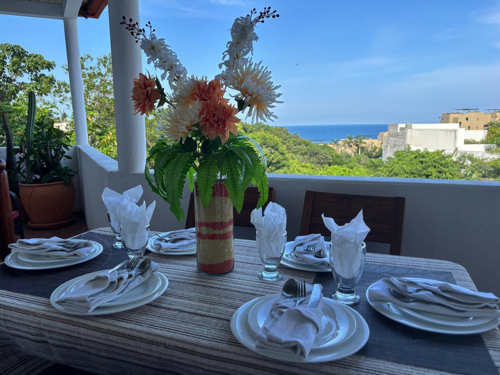 En esta casa de descanso vacacional, puedes contemplar vistas preciosas hacia la playa del arrocito y a la Bahía de Tangolunda, puedes disfrutar de unas hermosas puestas de sol desde su mirador, y pasar unas horas de entretenimiento en su refrescante alberca, a solo 5 min caminando tienes la playa de el arrocito, dónde puedes disfrutar del mar y la arena.